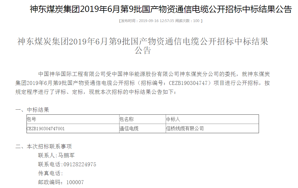 點擊數:64832019-11-21 00:00:00 來源: 神東煤炭集團2019年6月第9批國產物資通信電纜公開招標中標結果公告